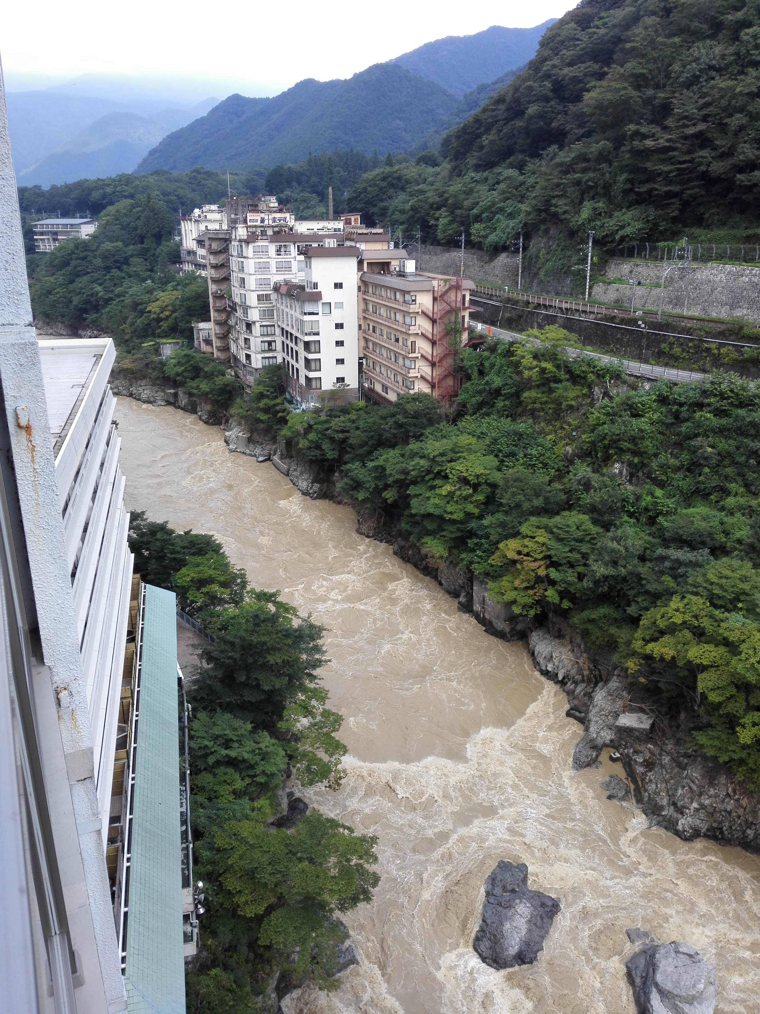 ホテルの部屋からの長めですが、鬼怒川は濁流状態です